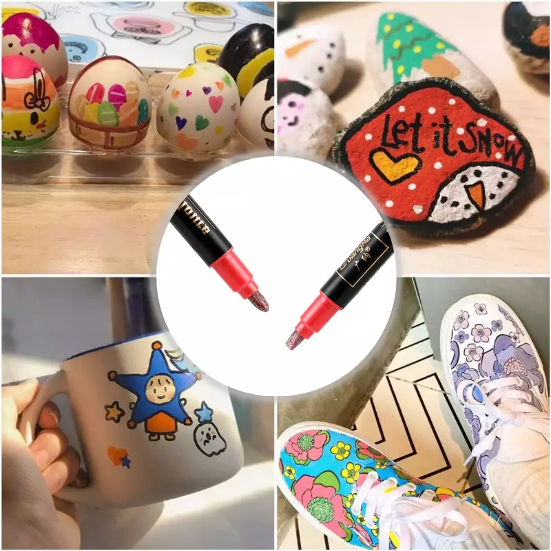 Outras Canetas prometem realmente ser permanentes, porém, elas só funcionam em tecidos e papéis. As Canetas Artísticas Cintilantes possuem a tecnologia Acrylic Painter em sua fórmula, o que torna sua tinta permanente em vários materiais, depois de seca.